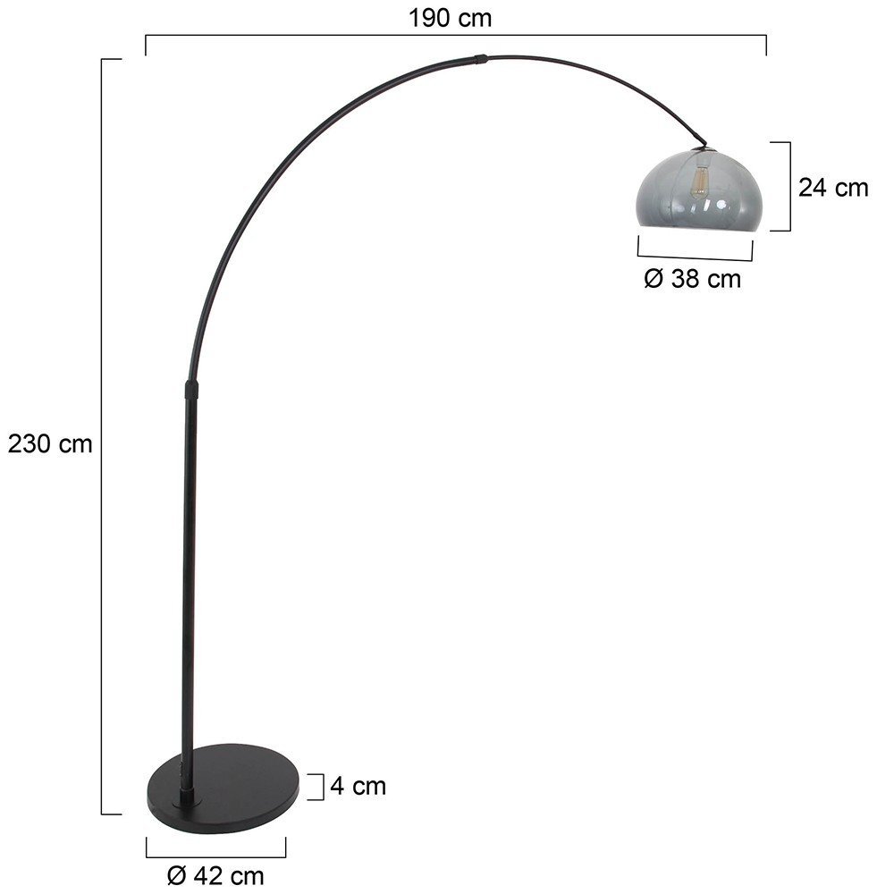 Stoere booglamp van Steinhauer. Deze zwarte lamp wordt geleverd met een donkergrijze plexi bol. De zware voet maakt het mogelijk dat deze lamp tot 190cm uit te schuiven is en een hoogte van 230cm te bereiken is.