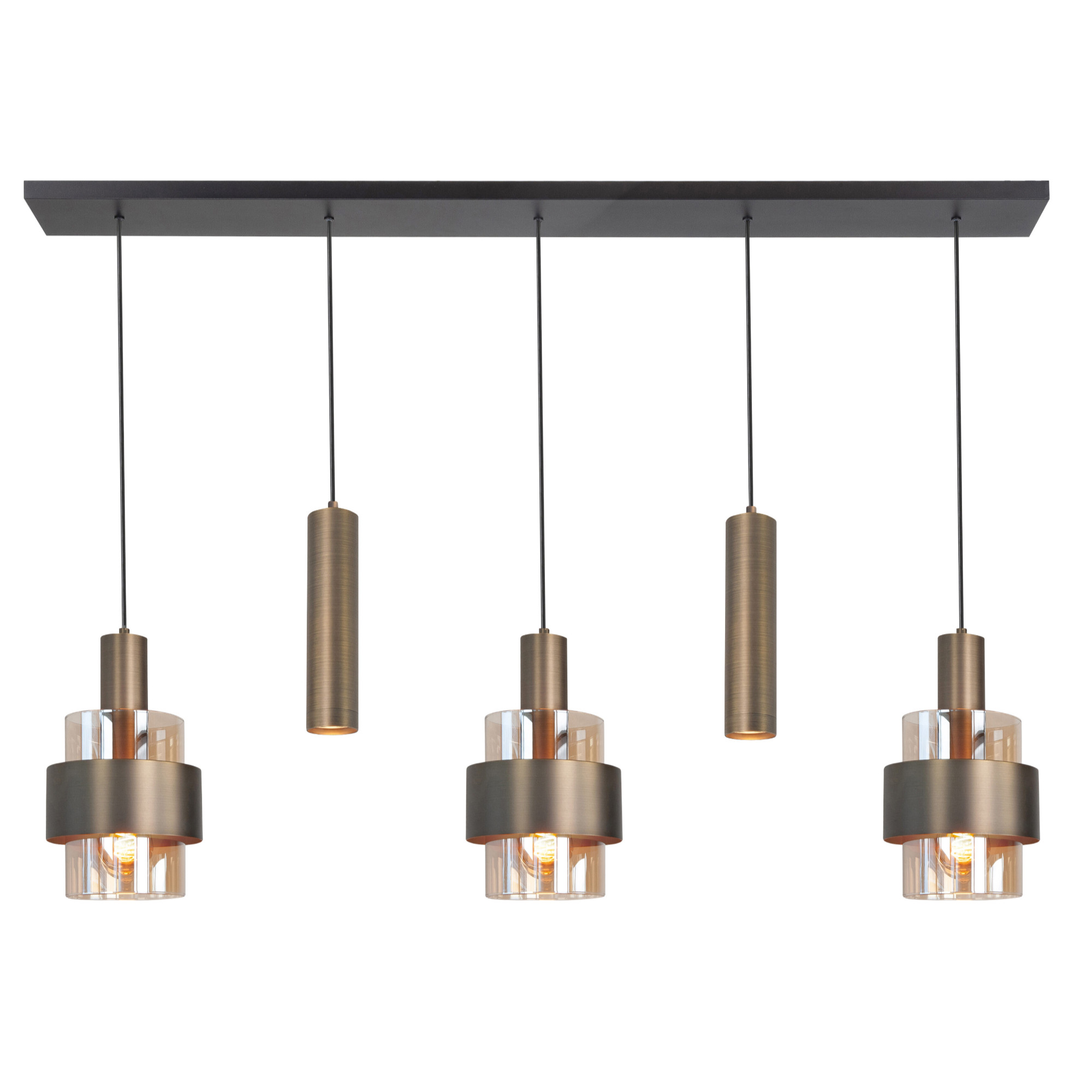Leuke hanglamp waarbij het warme glas gecombineerd wordt met strakke kokers. Door de kokers heeft u goed licht op tafel terwijl het zachte amberglas voor de sfeer zorgt.